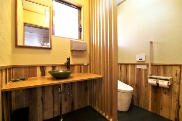 トイレと手洗いを別で設け、間に縦スリットの格子で区切りることで、開放感はありながら落ち着ける空間としました。