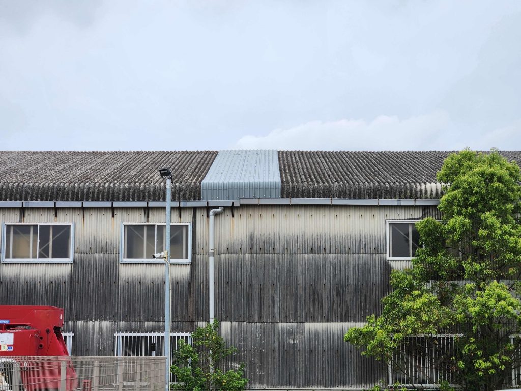 元々2つあった別々の倉庫を1つにつなげ合わせた倉庫でした。事前調査した際に既存スレート屋根材のジョイント部分の納まりに問題があったようで、そこを部分張替えすることで雨漏れの解消ができると判断し改修工事を行いました。足場も部分足場で設置可能でしたので、費用を抑える事もできました。